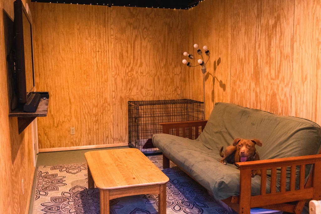 On the lower lever, you’ll find two large, wire crates for your use (bring your dog’s favorite bedding!).