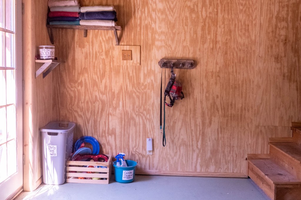 A Dog Wash station is located just outside the basement door with a hose and a hitch.