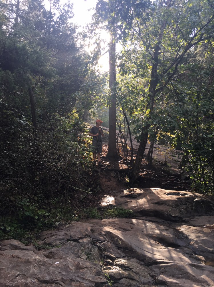 This is nice loop trail – no views, just a long gorgeous hike in the woods. There is very little traffic on the trail and if you find you need to cut it short, you can always take the Jump Trail that cuts off the larger part of the trail. It’s a great place to build carnes or leave dogness stones (or find the ones I leave!). It’s one of my favorites for a nice quiet walk in the woods—the trail is wide so no real danger of poison ivy. A few short up hills and slightly rocky in places (mostly round riverstones), and you can sometimes also watch a few of the stations on the zipline tours. Access the trail by parking at the pavilion where the zipline tours meet. (drive to the end of the main road into the park and turn right and take first right)