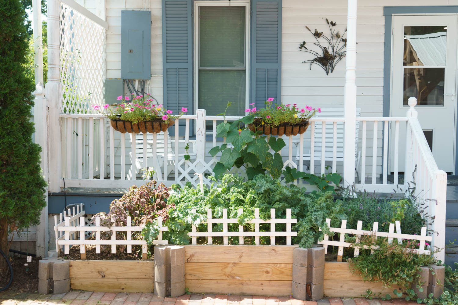 There are raised beds full of flowers and herbs (and sometimes vegetables), please feel free to utilize the herbs (and pick the blueberries if you are lucky enough to be here when they are in season!).