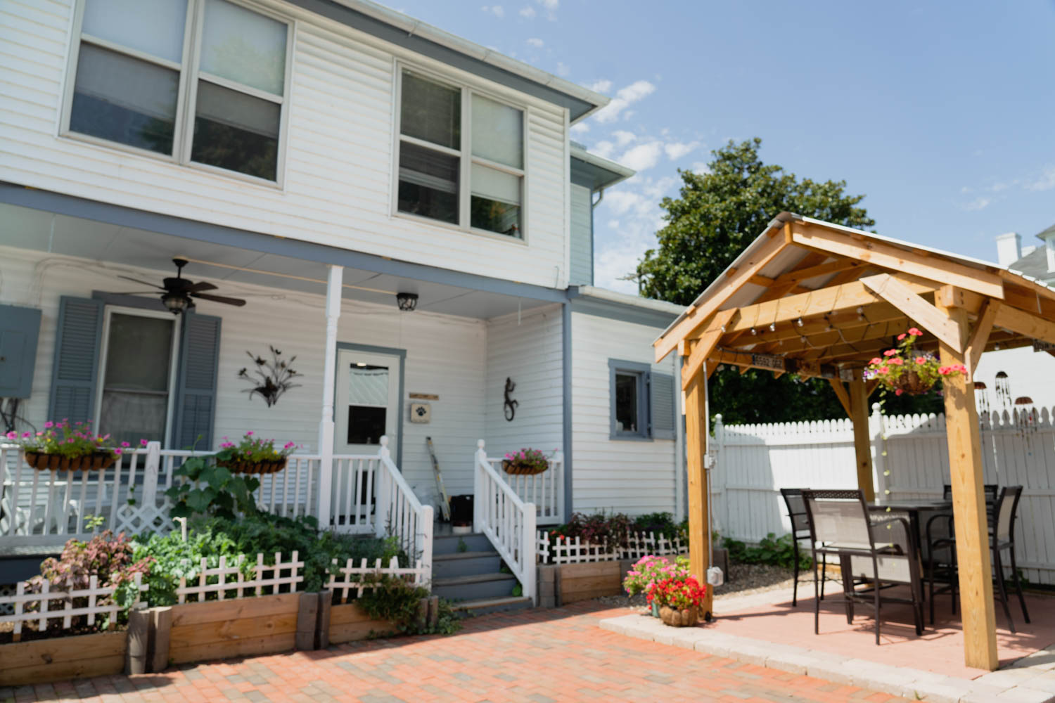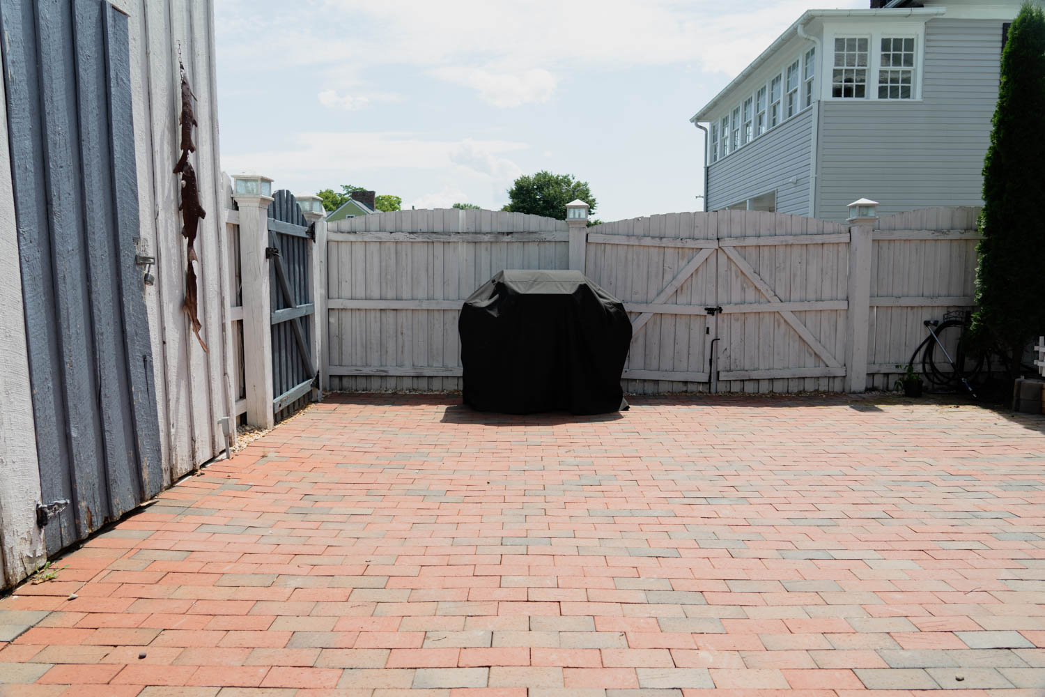 The covered porch has two chairs and table. It steps down to the brick patio which is a lovely little open space for dogs to play. (As an added bonus, they’ll be simultaneiously filing their nails!) On the patio is a pavilion with twinkle lights and a glass top bar that seats four.