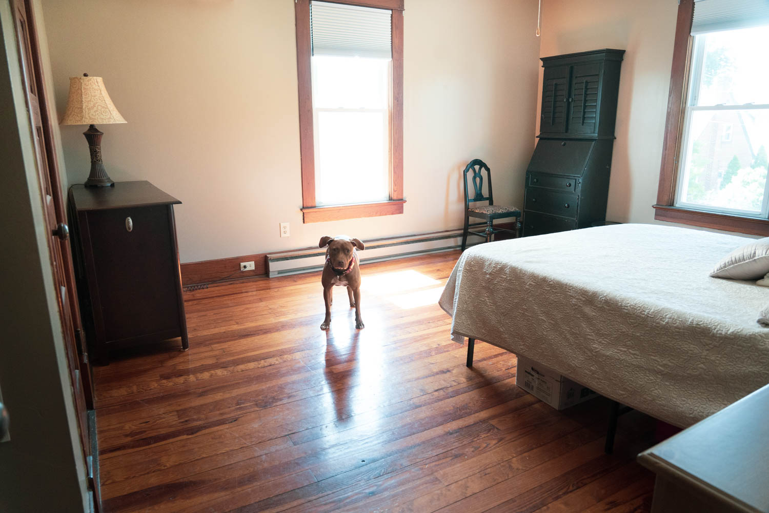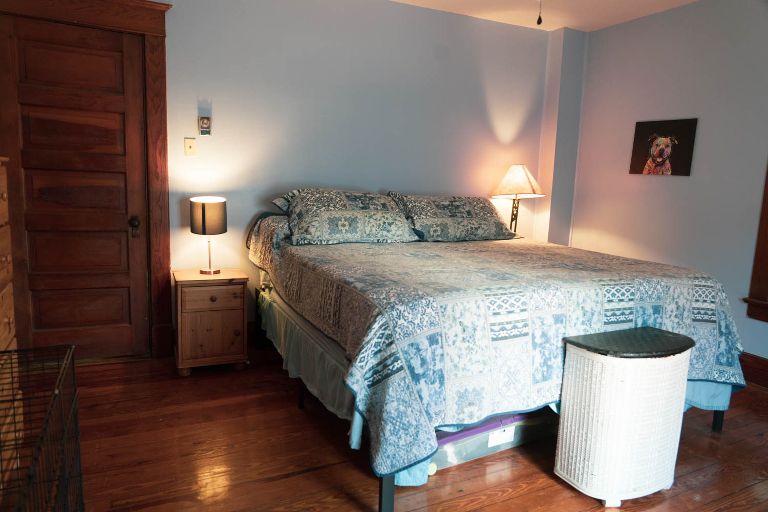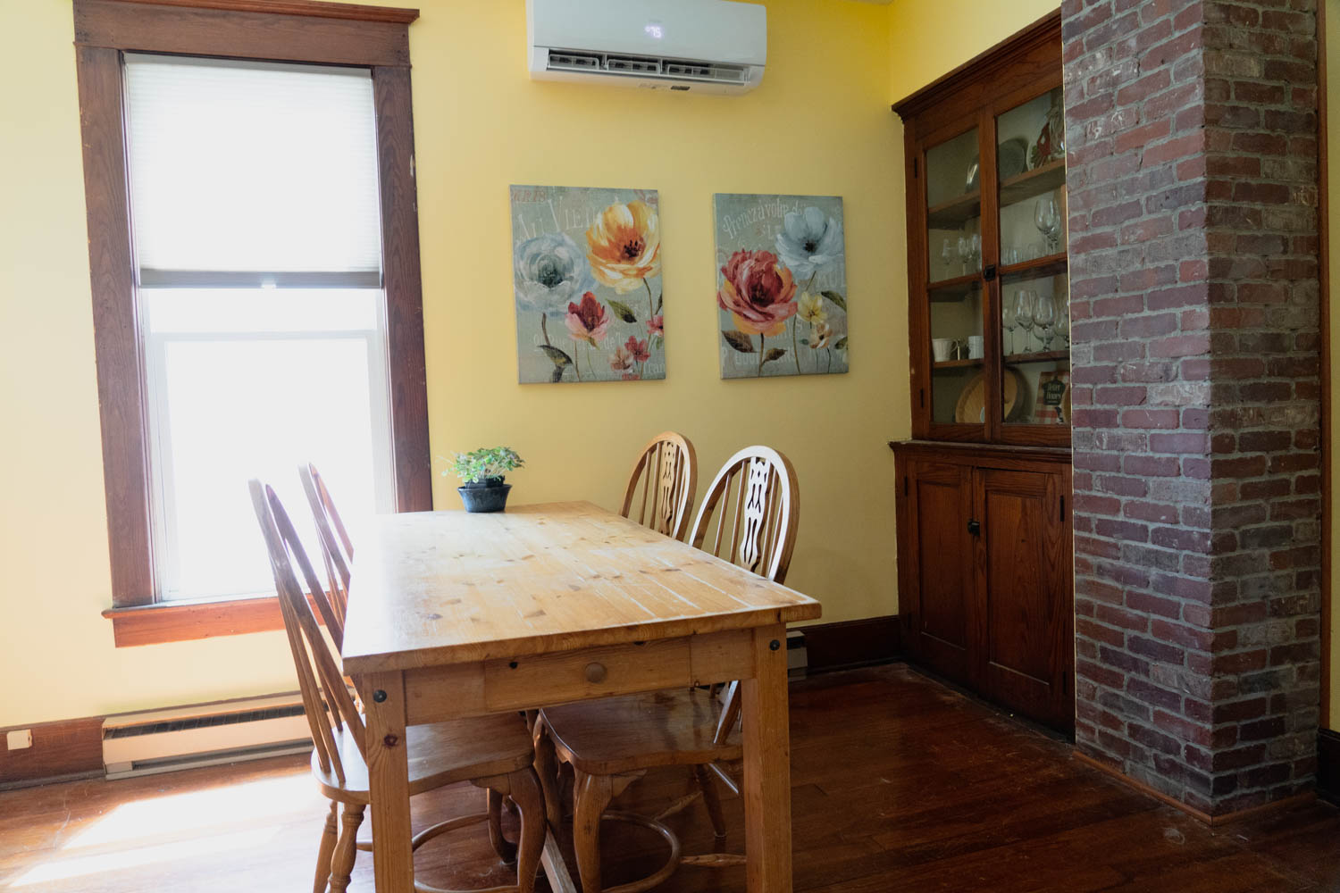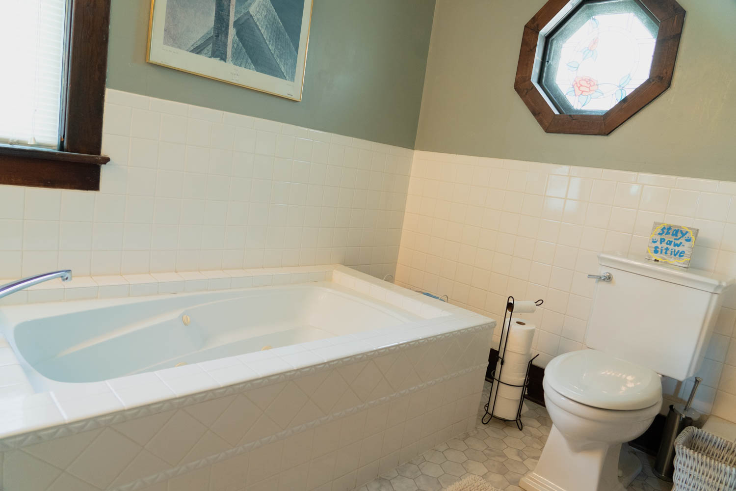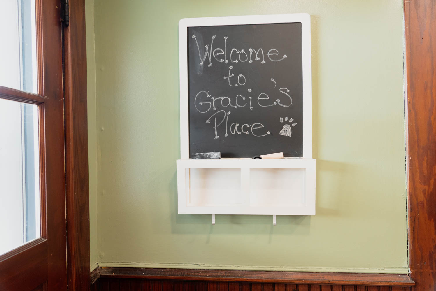 You enter Gracie’s Place through a key code lock on the back porch door (inside the backyard patio). The house is heated and cooled with ‘mini-splits’ so you can control the temperature in each room. There is also extra baseboard electric heat to take the chill off on extra cold days. There are beautiful wood floors throughout the house that have been lovingly patinaed by the nails of years of dogs. The original woodwork is chestnut and many of the floors have the slopes created from nearly a century of settling and foot traffic.