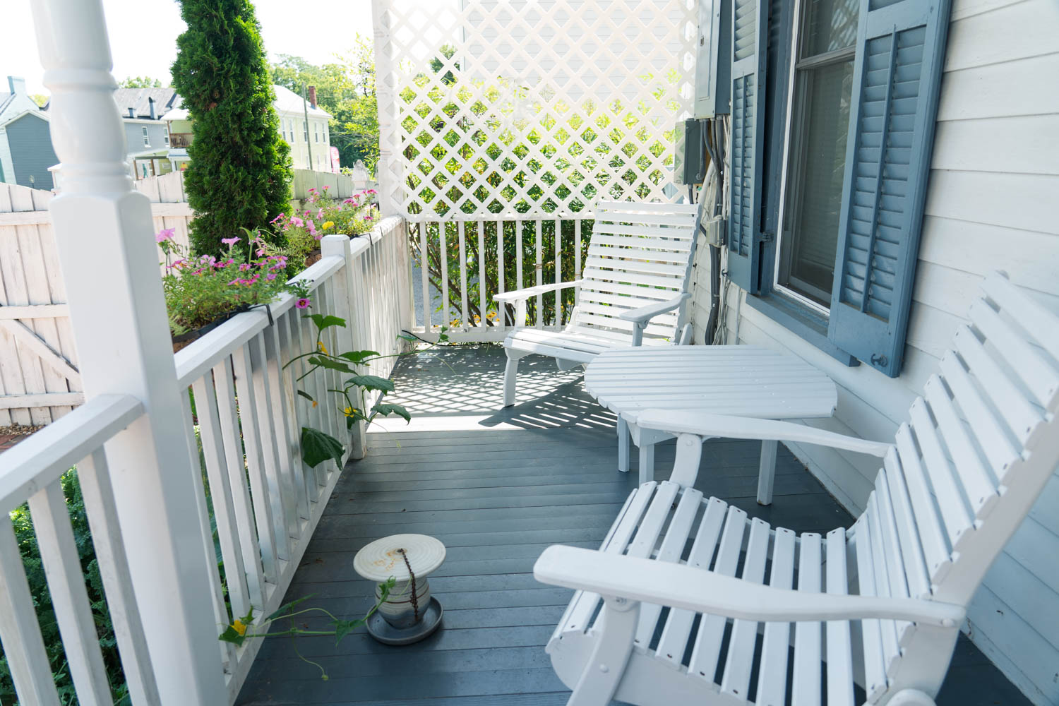This small porch is a nice, quiet spot to sit and read. It gets morning sun and looks out over the back patio (and the comings and goings of the ice cream store!)